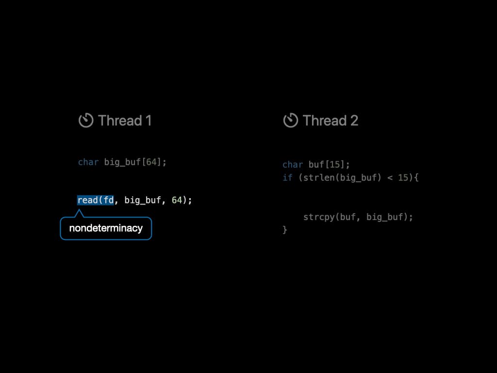 There is another key fact in the example. Thread 1 tries to read content from a file descriptor. What if the content itself has a length smaller than 15? Then there will be no bugs! The input to a program will affect its behavior. The system call read() is an example of introducing nondeterminacy to a program.