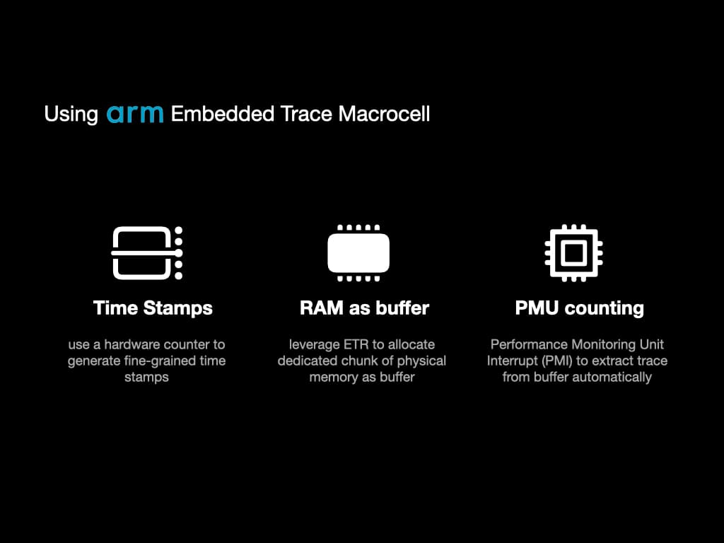Second, we leverage ETR to allocate a dedicated chunk of physical memory as a buffer of ETM. That means the ETM output stream is directly sent to RAM. We can avoid frequently pausing the program to get ETM output, which will alleviate the performance.