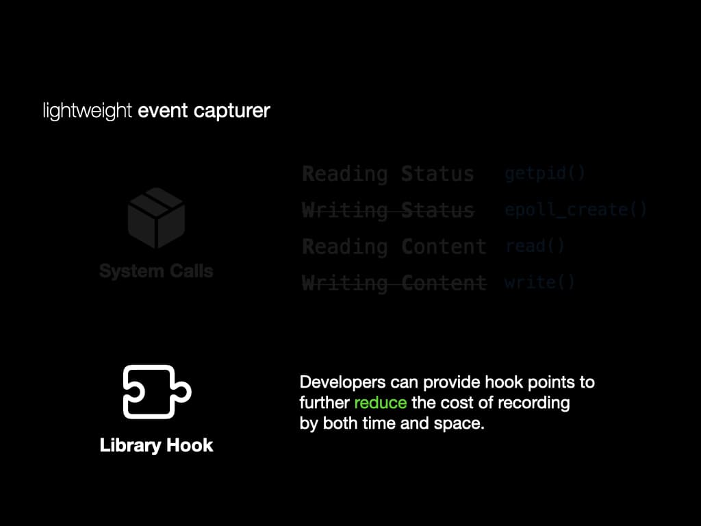 Instead of tracing the full execution, we implement a lightweight event capturer to record system calls, exceptions, signals and interrupts.
