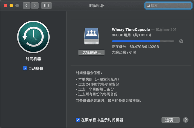 The AP speed in the school dormitory area is very slow (dormitory area --> Zhiyuan Building). The first backup took a full 6 hours. But after setting up this service, as long as the MacBook is connected to the school's internal network, it will automatically backup every hour. These backups are seamless, taking only a few seconds each time.